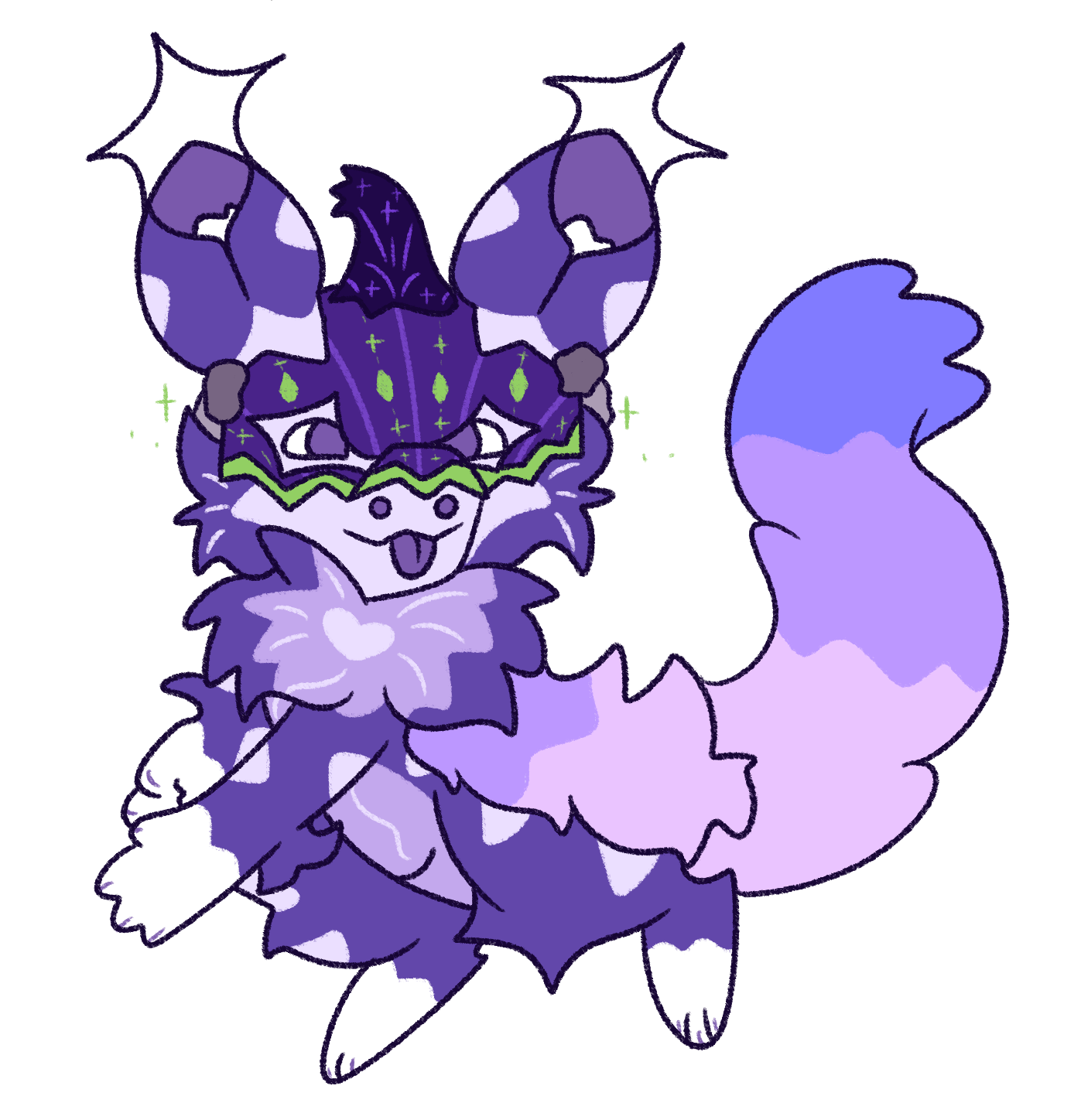 Kapow has spent his whole life making beautiful smokeless fireworks (his secret to how they work!) so of course his mask would be themed around that. The base of the mask is purple like the darkened sky, and the shapes are meant to portray lights that bring joy in the heavens!