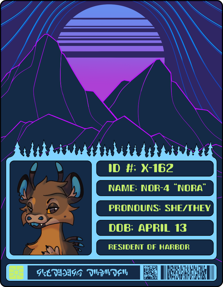 Passport of X-162: NOR-4, known commonly to others as "Nora". Nora was raised in B'Haddu after emerging from her capsule alone, her 3 intended siblings mysteriously gone (she ate them lol). Growing up she garnered a bit of a mean streak, rendering her into more of the solitary type. She moves to Harbor in hopes of getting a fresh start where she can (hopefully) be nicer and forge meaningful relationships.