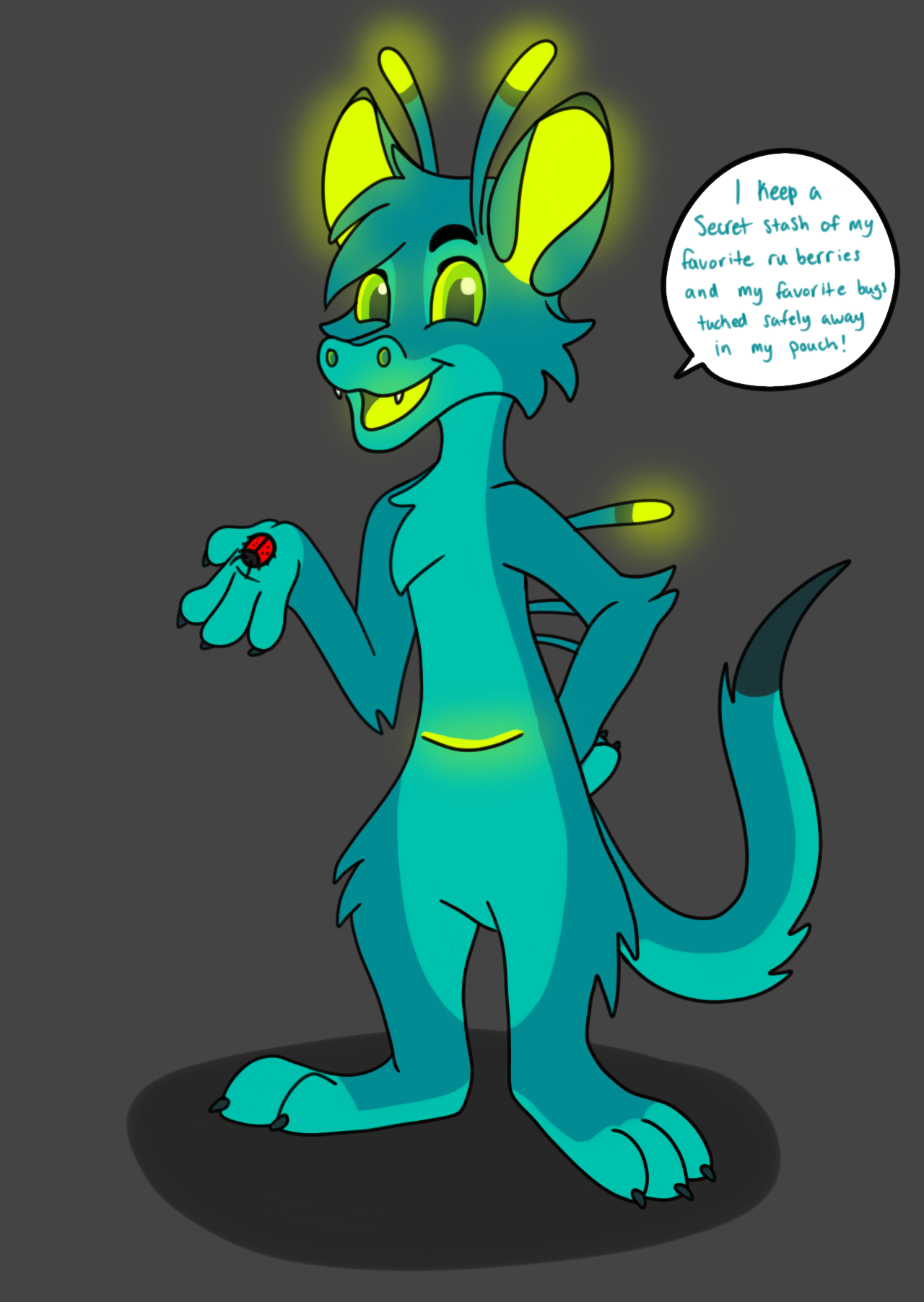 Ziggy loves to stow away his favorite bugs and berries in his pouch!