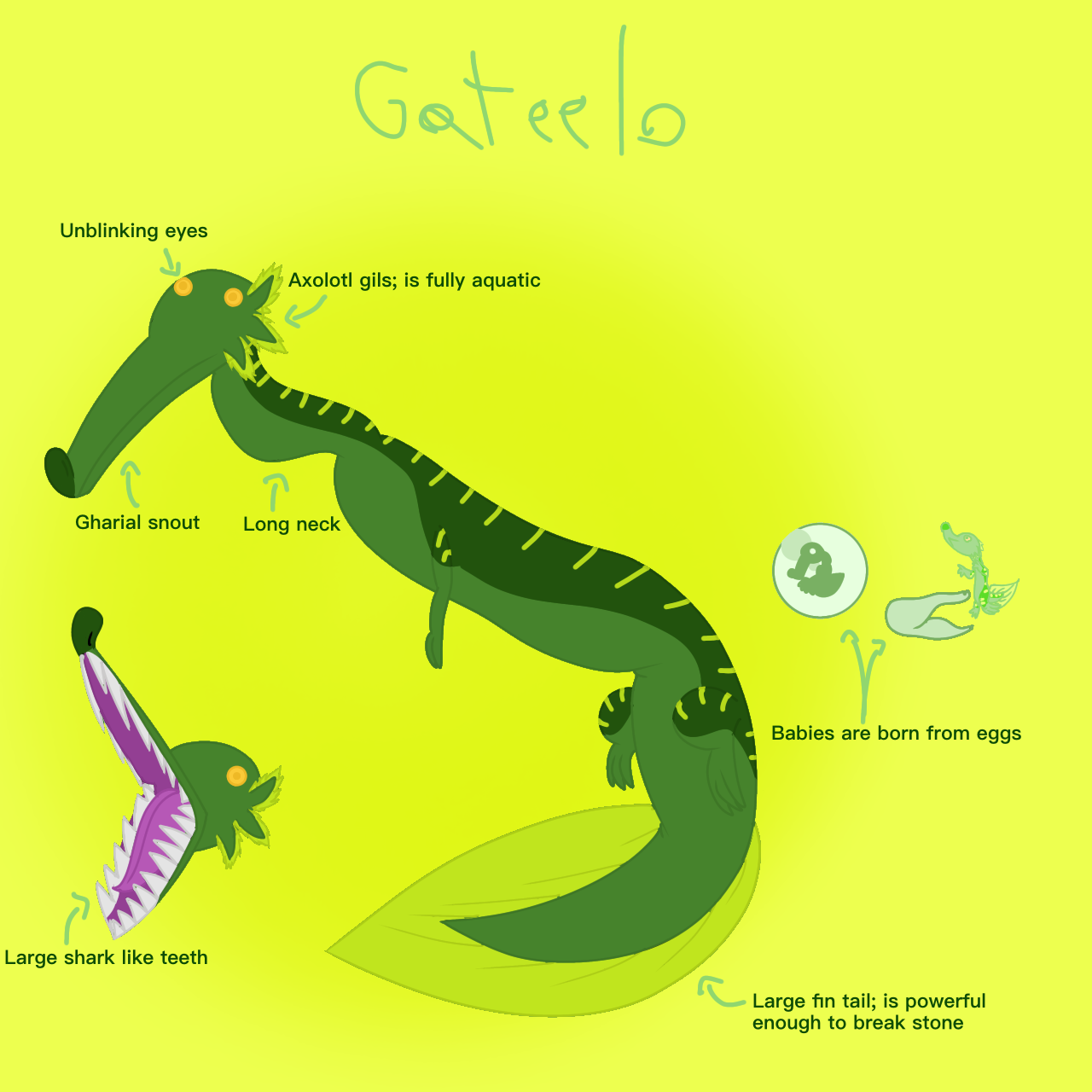 The Gateelo is a long, eel like creature with a long powerful jaw made to catch and eat large fish. They are huge; being around 50m long in females and 33m in males. Gateeloes are fully aquatic and reside in warmer sections of the ocean where they are one of the top predators. They come mainly in shades of green thought sightings of them coming in yellow had been spotted. Gateeloes are an egg laying species and females can produce up to 100 eggs. Most of the young (called Plips) are eaten by each other or by opportunist predators and only 2-5 plips will live to reproductive age. Females are known to carry their young on their backs while hunting.