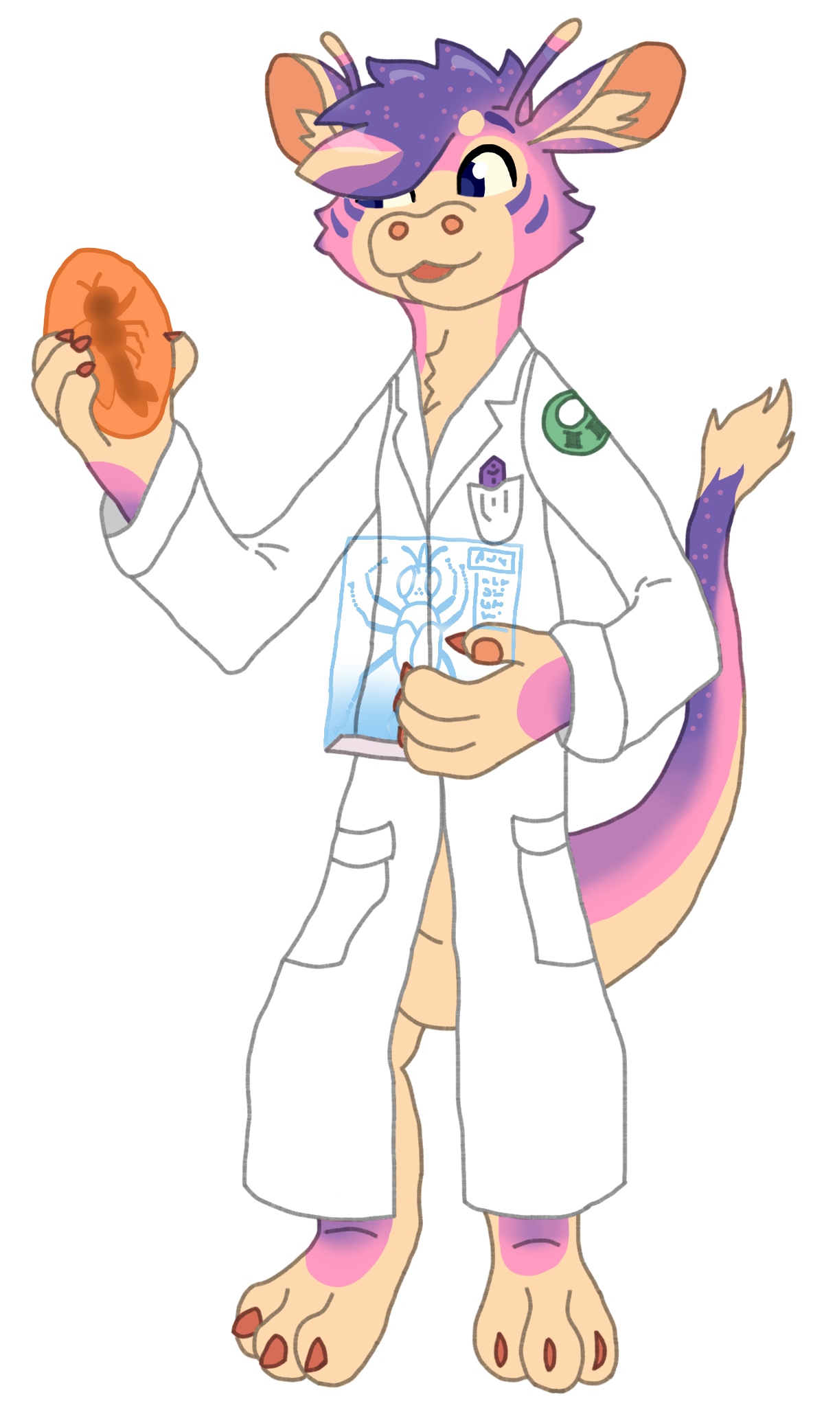 yeah celestes fur blending from pink to purple is so pretty but can be such a pain when you just want to make it an easy transition. often what I do is put down a layer of pink and then mark out where the purple is solid on another layer and use a soft brush to blend on a different layer the pink and purple. you did really well as she looks super cute! Also I just love the lab coat I might make that one of her normal clothing pieces!