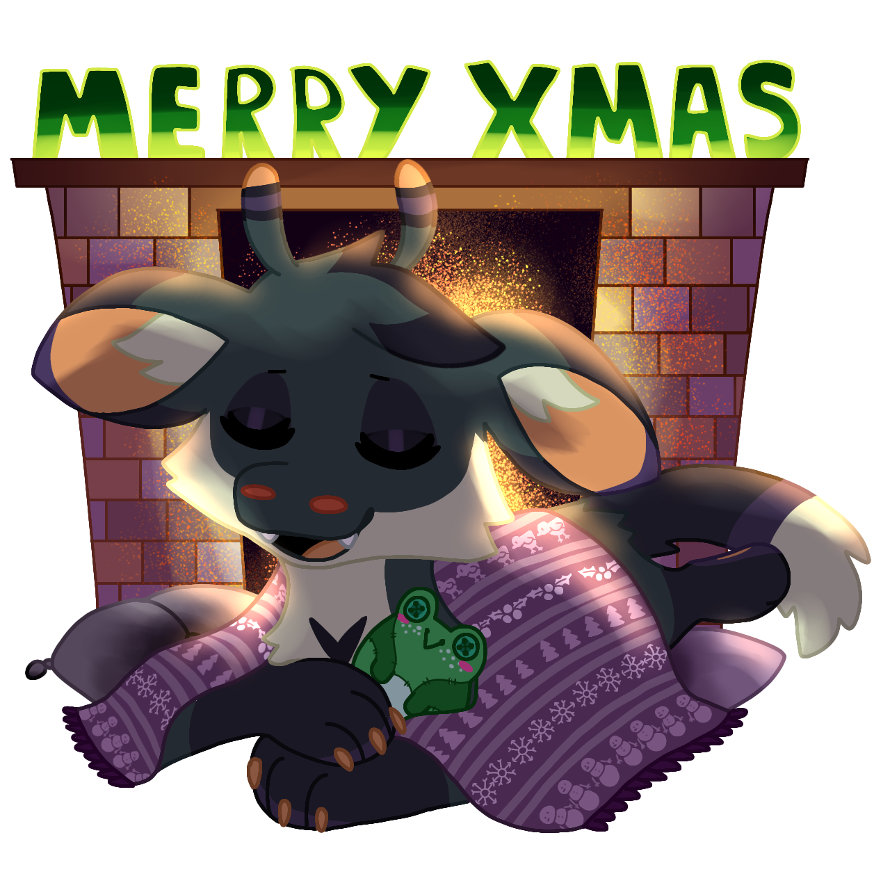 With Winter covering the outside world in a white blanket, all the bugs Frog loves to catch have hidden themselves away to keep warm. Frog instead started a nice cosy fire, with a nice warm blanket over him and a little plushie friend :)