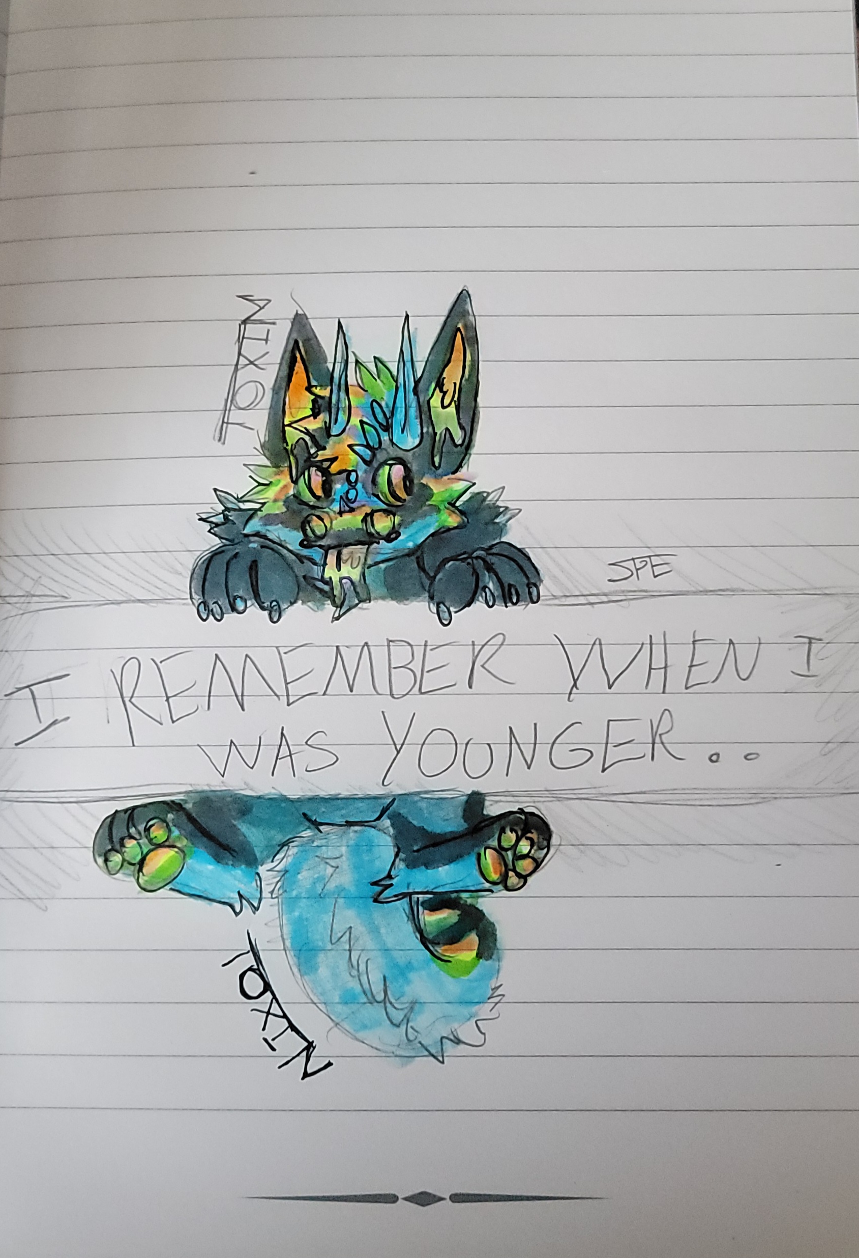 Used highlighters, some cheap markers, colored pencil, a black scented marker and lined paper!! Tried to reference my old middle school style :3